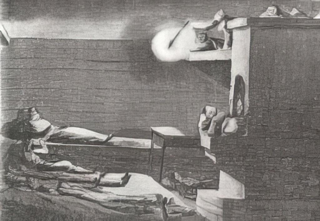 «Квартиры – понимаете? Квартиры! Не бивуак, не лагерь, а настоящее место для постоя – дворец, рай!» – записал поручик Чичерин в дневнике 11 ноября, в первый раз за две недели, когда русские войска останавливались на ночлег не в снегу. На рисунке мы видим его самого с братьями-офицерами, жмущимися как сардины в банке на полу, а самый большой счастливчик устроился на полке над печью – в тепленьком местечке. |