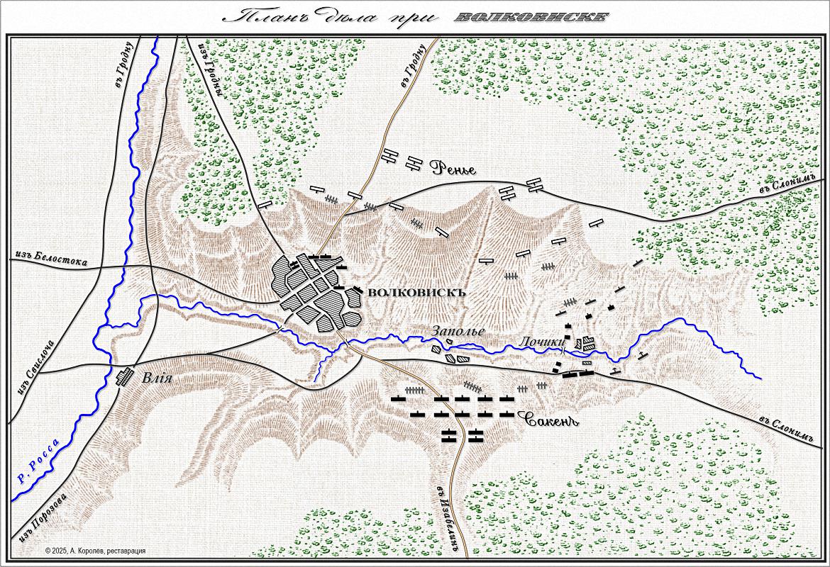 Город лежит в котловине; за водой, со стороны Изабелина до главной дороги на Белосток, простираются холмы, в тылу которых доминируют еще более высокие возвышенности. С другой стороны, вдоль дороги на Мосты и до района Слонима, местность также поднимается ступенями, и первый выступ отделен от второго слегка понижающимся холмом, где корпус разбил лагерь. Впереди, ближе всего к краю, находилась II-я дивизия, обращенная к городу; дальше сзади находилась I-я, авангард которой был справа, а дивизия Дюрютта – слева. В Волковыске мы встретили два батальона французов и один батальон вюрцбурга. Между подножием холма, где был расположен лагерь, и городом было ровное пространство шириной от 1000 до 1500 шагов. На этой равнине располагалось обнесенное стеной еврейское кладбище и одна единственная корчма.