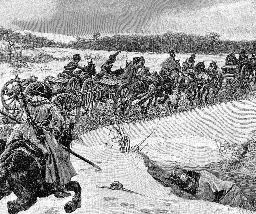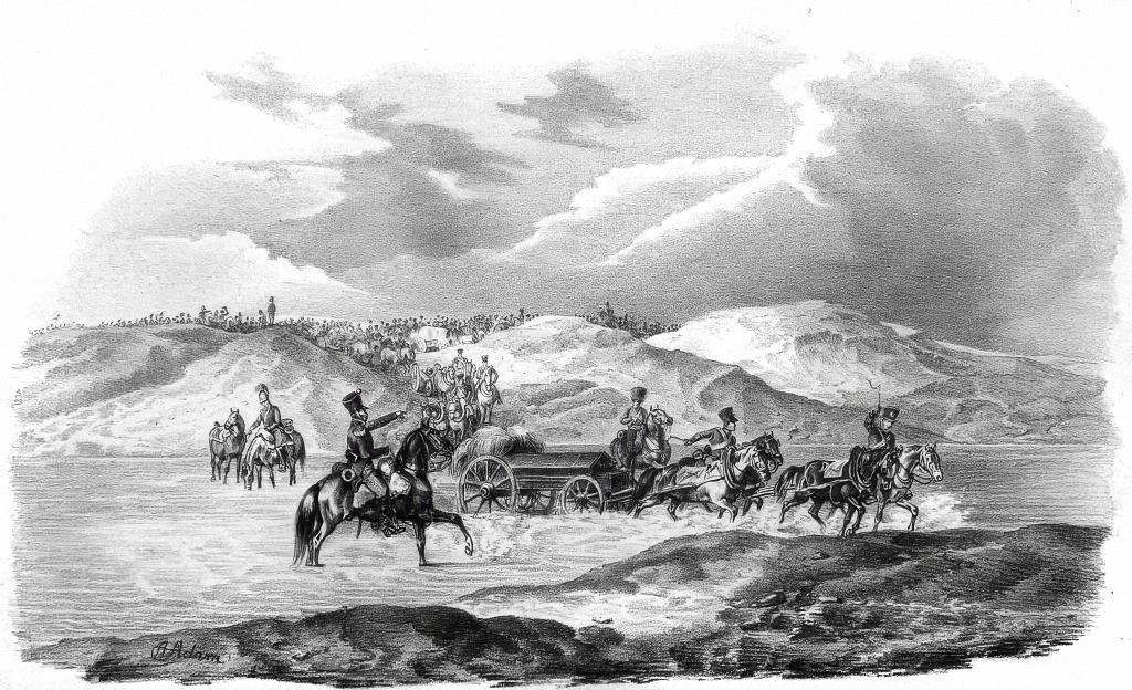 Русская конная артиллерия обстреливает наполеоновские войска, переправляющиеся через Березину в 1812 году.