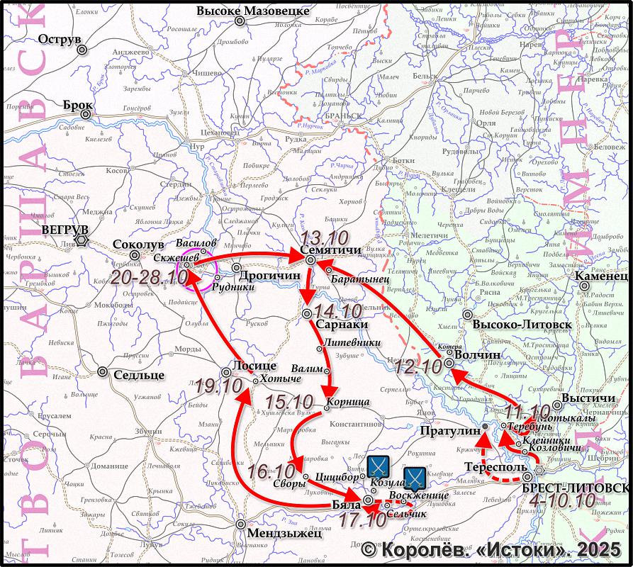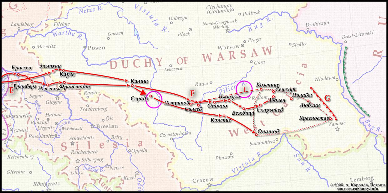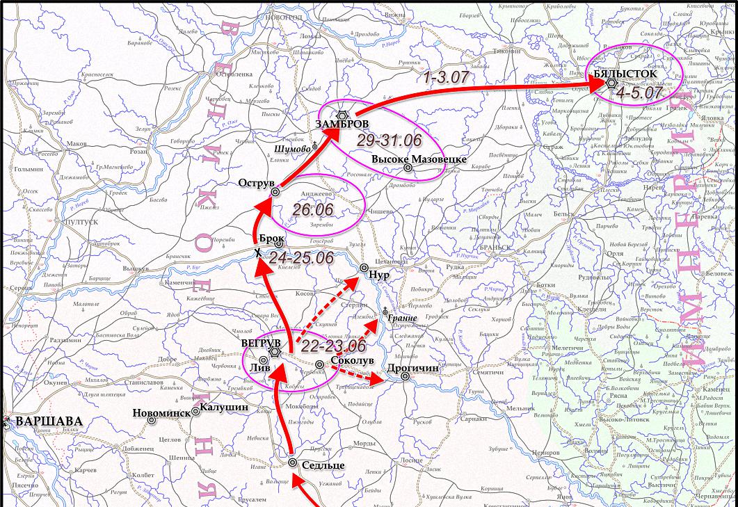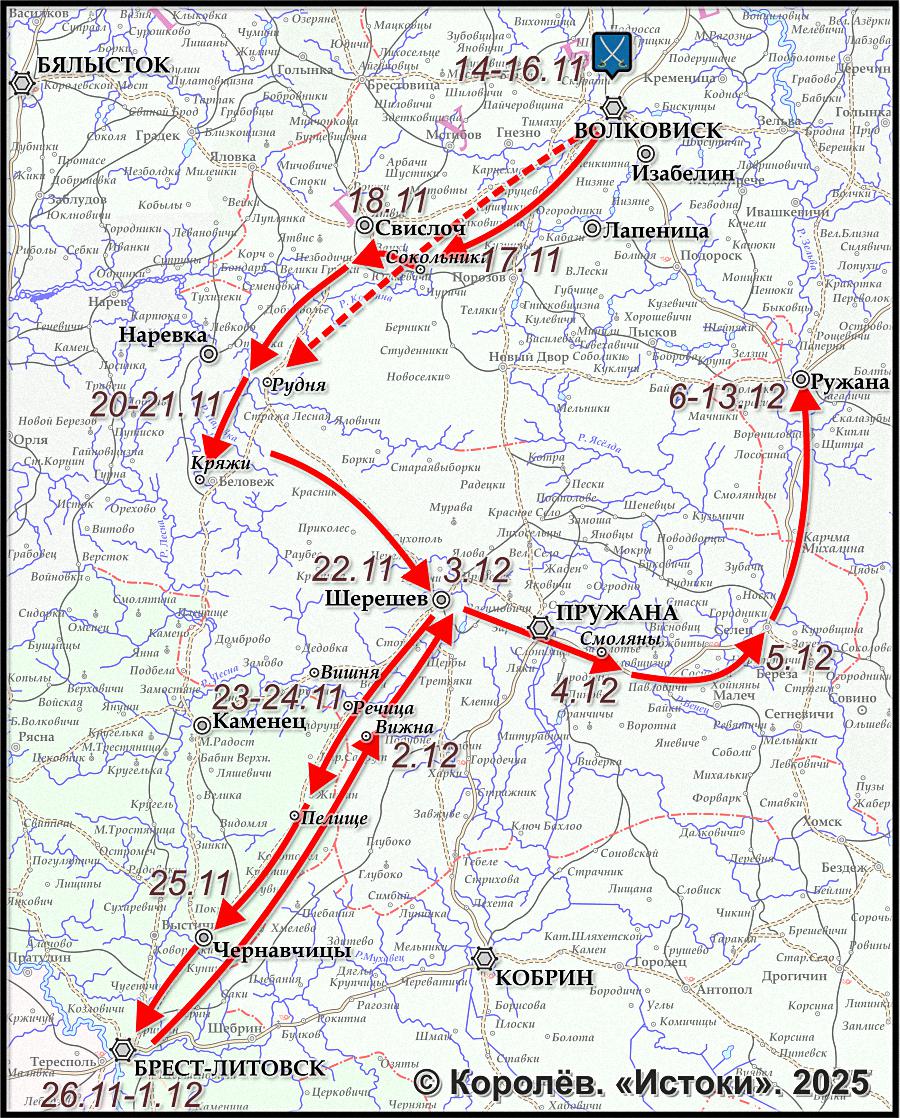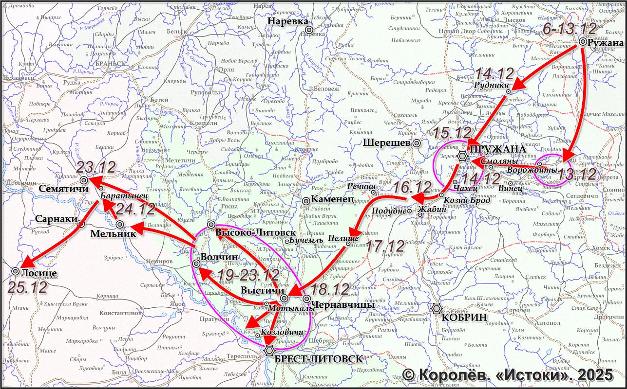 В начале декабря эти 16 батальонов насчитывали 6498 человек, 24 пушки (3 батареи), III-й батальон полка Walcheren все еще находился в Белостоке... а II-й батальон 2-го полка la Méditerranée отправляется туда из Варшавы 16 декабря.